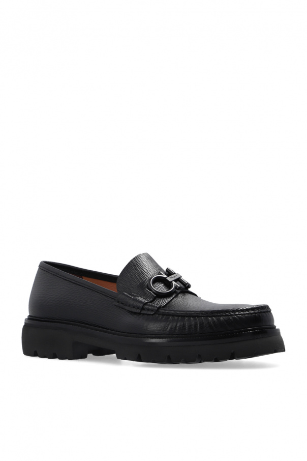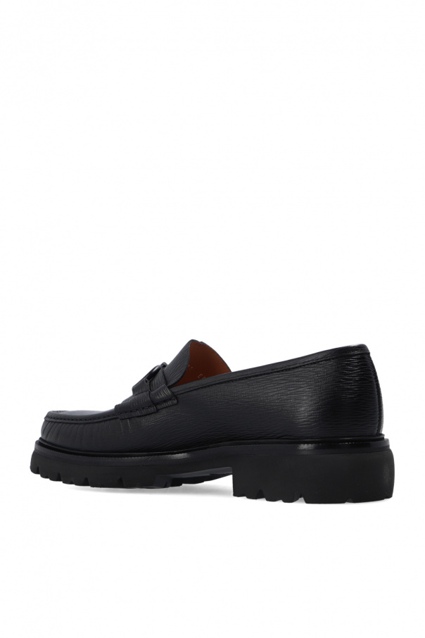 Black ‘Bleecker’ moccasins from Salvatore Ferragamo. Made of textured leather, this pair rests on a black rubber sole and has a strap with the label’s signature ‘Gancini’ appliqué in black.