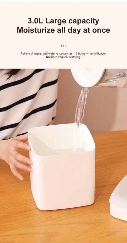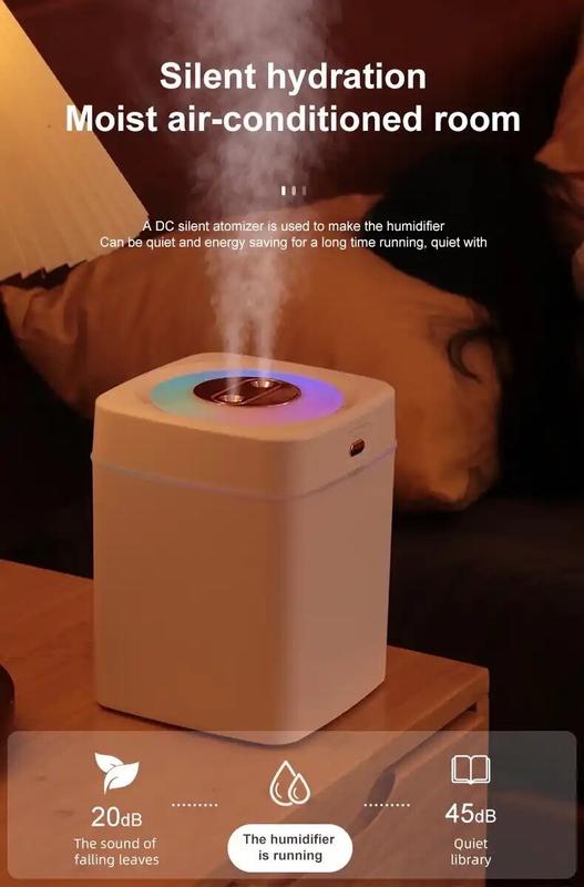 Большая емкость: увлажнитель имеет емкость 2,6-3.0л, который может удерживать большое количество воды, гарантируя, что он может работать в течение длительного времени без заправки. • Цветной свет атмосферы прыжков: увлажнитель оснащен цветным светом атмосферы прыжков, способным создать расслабленную и успокаивающую атмосферу в любой комнате. Метод увлажнения выбросов тумана: метод увлажнения выбросов тумана для обеспечения равномерного увлажнения воздуха, обеспечивая комфортную и здоровую среду. • Низкий уровень шума: уровень шума 36-45 дБ, этот увлажнитель работает тихо, позволяя вам работать или спать без каких-либо помех.