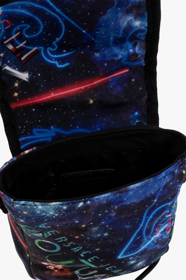 Multicoloured shoulder bag from Versace Jeans Couture. Embellished with the brand\'s signature ‘Space Couture’ pattern, this design features a snap fastening, a rubber logo patch on the front, a back slip pocket, one internal compartment and an adjustable strap with lobster clasp fastenings.