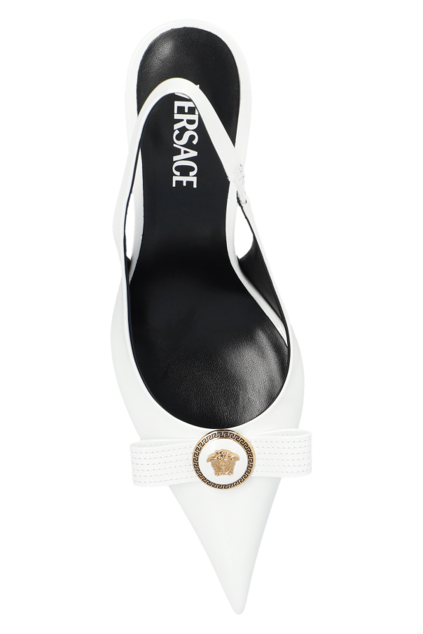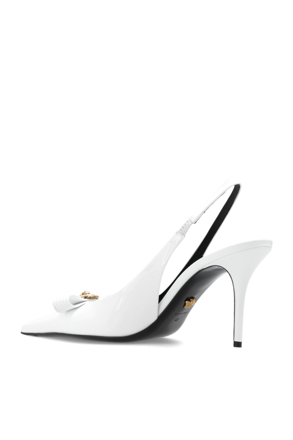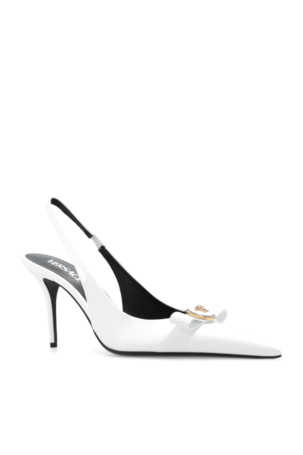 White pumps from Versace. Made of leather, this pair features an elastic strap to the back, pointed toe, Medusa head detail and black leather sole.