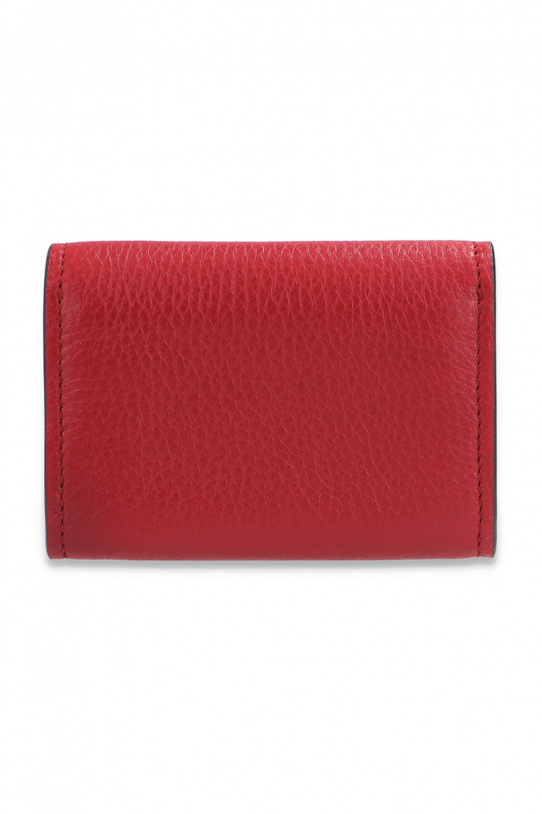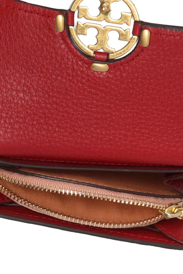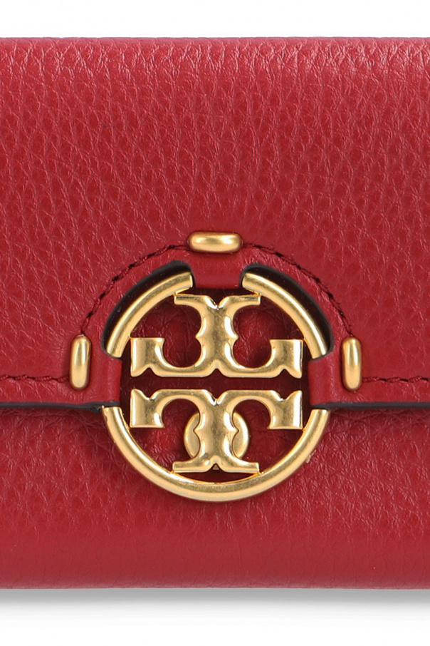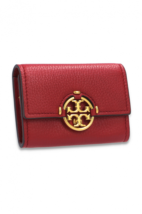 Red wallet from Tory Burch. Crafted from leather, this design fastens via a snap and showcases a logo emblem. It is complete with gold-tone metal hardware and an interior with two compartments, three card slots and one zip pocket.