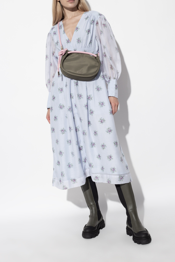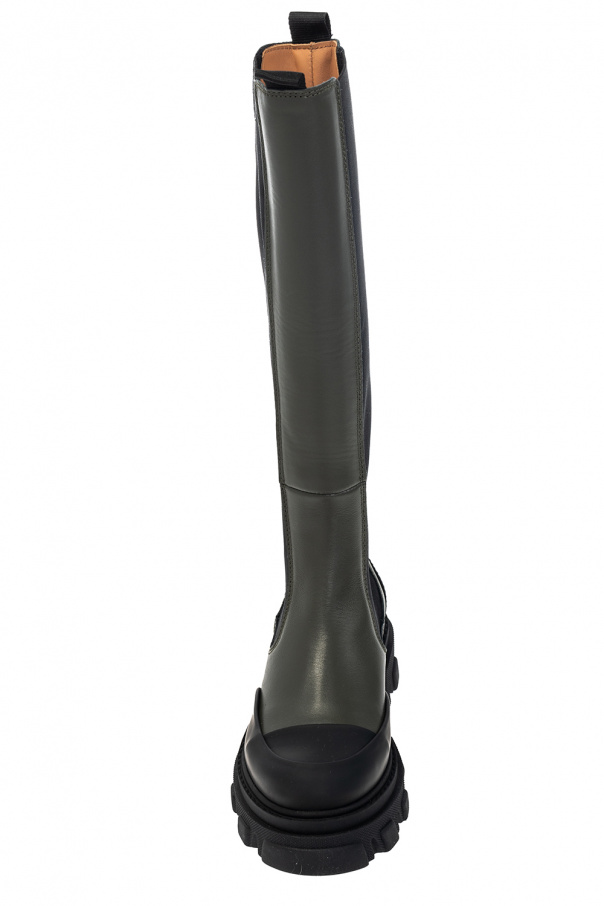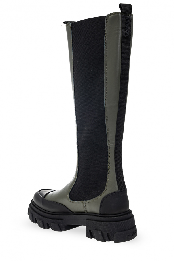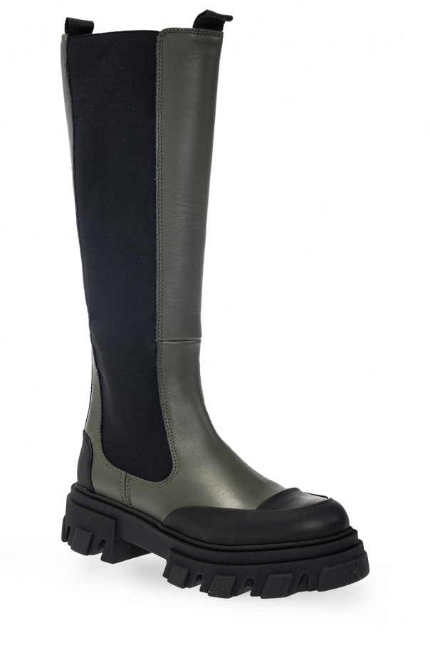 Green and black knee-high boots from Ganni. Crafted from leather and fabric, this lace-up model sits on a black rubber sole and features a black logo on the back.