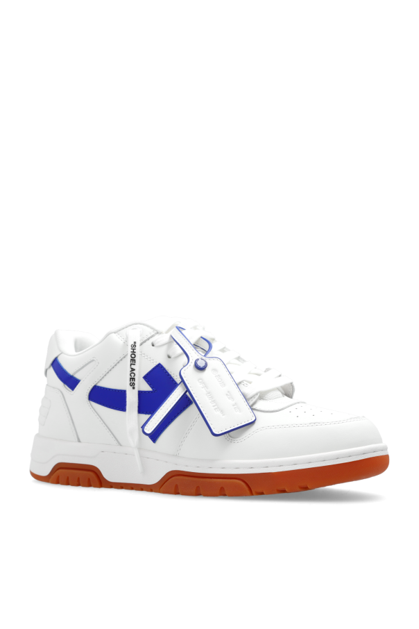 White ‘Out Of Office’ sneakers from Off-White. Made of calf leather with fabric trims, this lace-up pair features a perforated front, the brand’s signature dark blue arrow on the side, tongue patch, embossed logo at the back, detachable zip tie tag and rubber sole in white and brown.