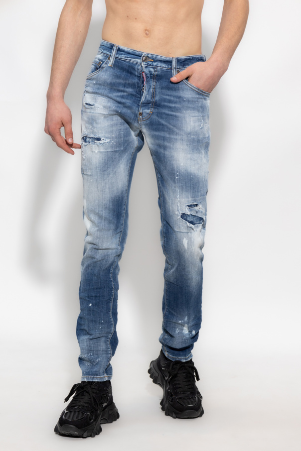 Blue ‘Cool Guy’ jeans from Dsquared2. Crafted from cotton with a vintage effect, this pair falls with tapered legs and features button fastenings and classic five pockets.