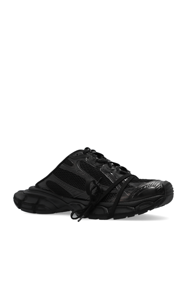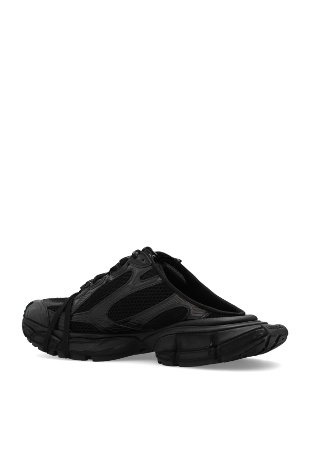 Black \'3XL\' slides from Balenciaga. Made from fabric, this model sits on a black rubber sole and showcases a decorative lace-up fastening, mesh overlays, distressed effects and tactile logo detailing on the front and back.