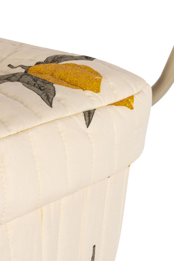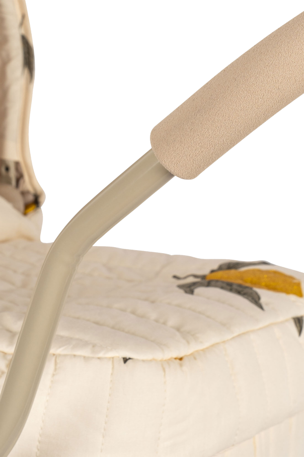 Cream vintage style doll pram with a lemon motif from Konges Slojd. Designed with four large wheels made in EVA material for extra stability. Features quilted printed fabric and a mattress made in 100% organic cotton. Designed with a softly cushioned storage basket under the lift. The frame is made of metal with spongy soft handles. Comes fully assembled. Easy to fold and store.