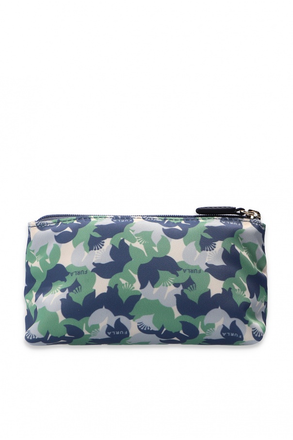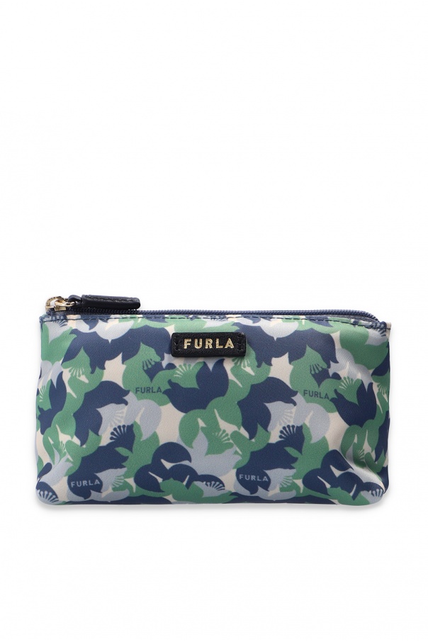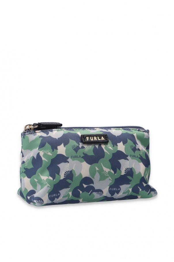 Blue, green and cream ‘Digit’ wash bag from Furla. Illustrated with a graphic print, this design features a zip fastening, a gold-tone logo patch and one internal compartment.