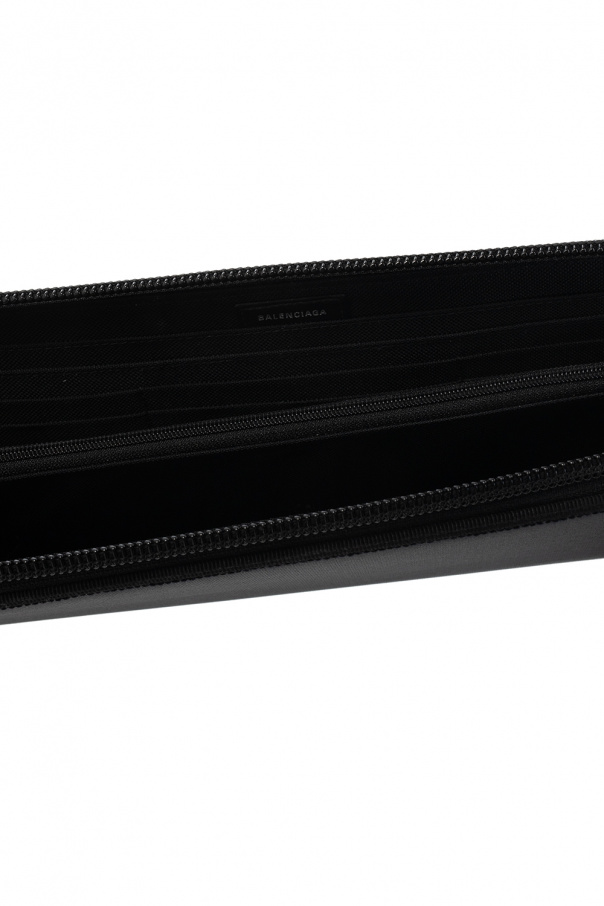 Black ‘Explorer’ shoulder bag from Balenciaga. Crafted from recycled materials, this model fastens with a zip and is decorated with a logo patch. It is complete with an adjustable strap, silver-tone metal hardware and two internal compartments with four slip pockets, one zip pocket and twelve card slots.