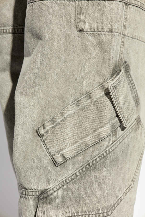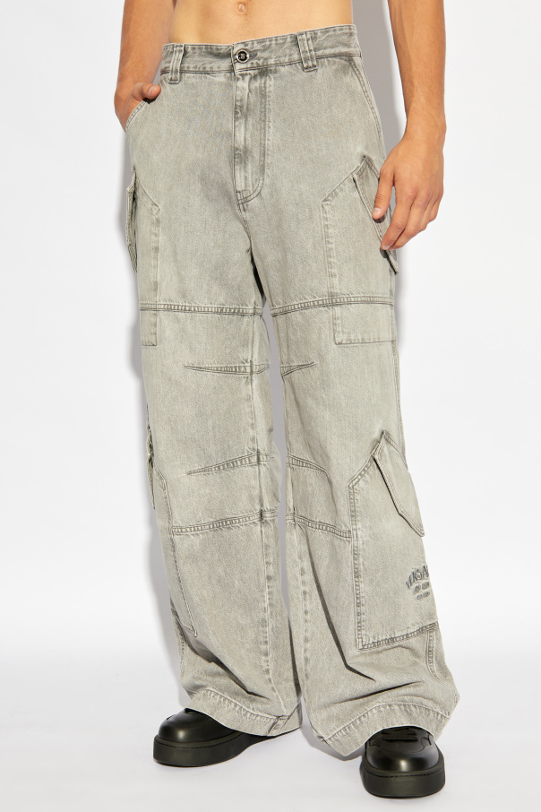We present to you the exceptional \'cargo\' jeans from the exclusive collection by Versace. These gray pants, made from premium quality heavy denim fabric, epitomize elegance and durability. They feature a loose, regular fit with wide, straight legs that ensure unparalleled comfort. Distinctive stitching throughout adds a unique style, while numerous cargo pockets positioned on the front, back, and sides of the legs highlight their uniqueness. The pants fasten with buttons and a zipper, and a designer logo patch on the back waistband emphasizes the exclusiveness of the product. The product is available in an elegant gray color. Why should you buy this product? Renowned brand Versace Made from high-quality 100% cotton Stylish, loose fit with wide legs Numerous functional cargo pockets Exceptional stitching and unique design