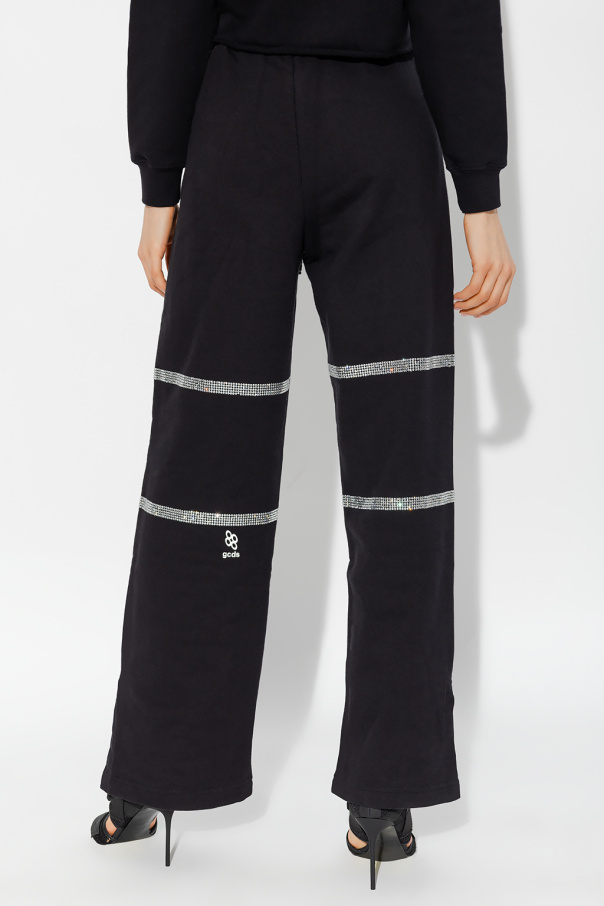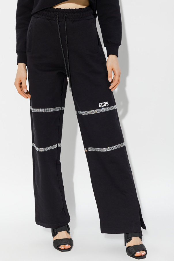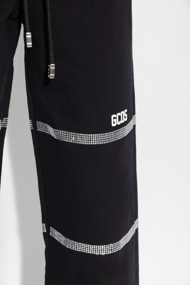 Black high-waisted sweatpants from GCDS. Made of cotton, this pair features an elastic drawstring waistband, two front pockets and straight legs decorated with a white logo print, crystals and slits.