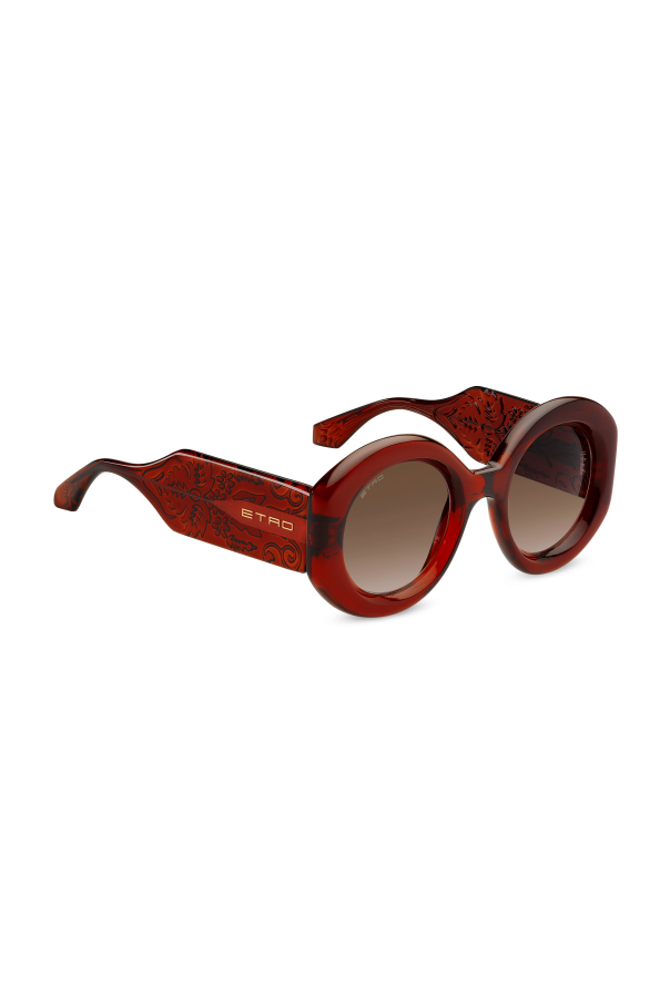 Discover the quintessence of luxury and distinctive style with the Etro Oversize Retro Sunglasses. Crafted with meticulous attention to detail, these sunglasses are a testament to the finesse and opulence that define the Etro brand. The bold red frames, adorned with an intricate embossed pattern, encapsulate a blend of modernity and timeless elegance. The sunglasses boast large, rounded lenses that evoke a retro allure, seamlessly merging oversized fashion with a touch of sophistication. Made from high-quality synthetic material, these frames offer both durability and comfort, allowing for a perfect fit and ease of wear. Additionally, the gradient brown lenses not only elevate the aesthetic appeal but also provide essential UV protection, ensuring your eyes are shielded from harmful rays in style. Detailing on the temples features the distinct Etro logo, cementing the brand\'s reputation for luxury and exclusivity. This emblem serves as a subtle nod to those who appreciate the finer things in life, making these sunglasses a must-have accessory for fashion-forward women. Why Purchase This Product? Luxurious design with an intricate embossed pattern for a unique, standout accessory. High-quality synthetic material ensuring durability and comfort. Gradient brown lenses with UV protection, blending functionality with fashion. Iconic Etro logo on the temples for brand recognition and added value. Retro oversized style that offers a sophisticated and refined look.