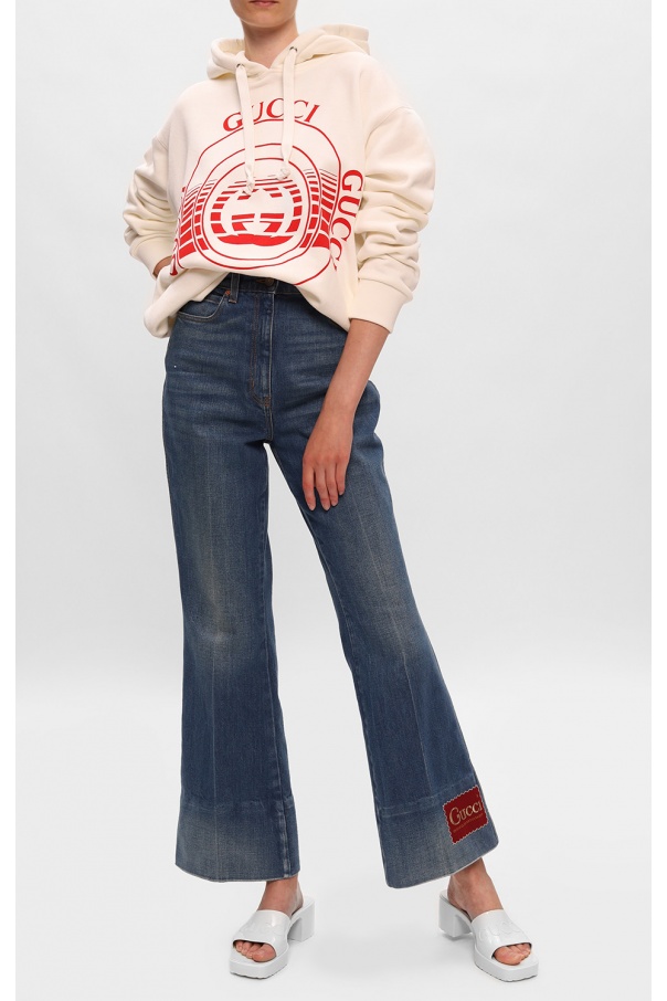 White heeled slides from Gucci. This design is made in rubber and features an embossed logo, white rubber sole and a chunky square heel.