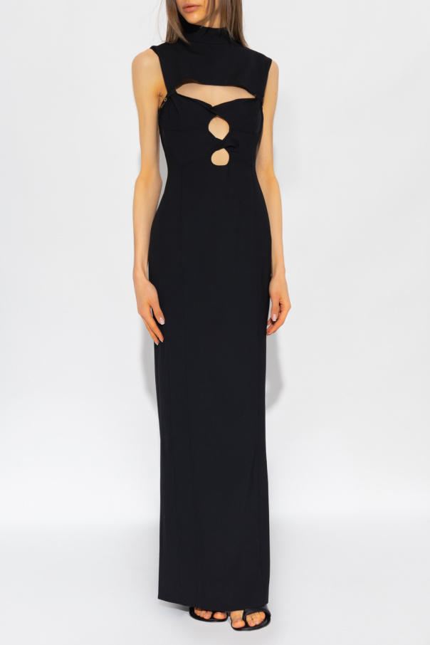 Black dress from Jacquemus. Crafted from soft wool with a touch of elastane, this style features a slim-fitting silhouette, snap fastenings, a hidden zip closure, decorative cut-outs on the front, an open back with a bra strap, and a fitted bottom with a high vent.