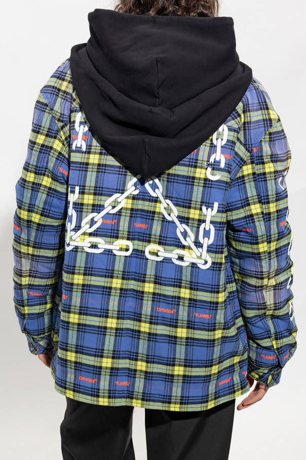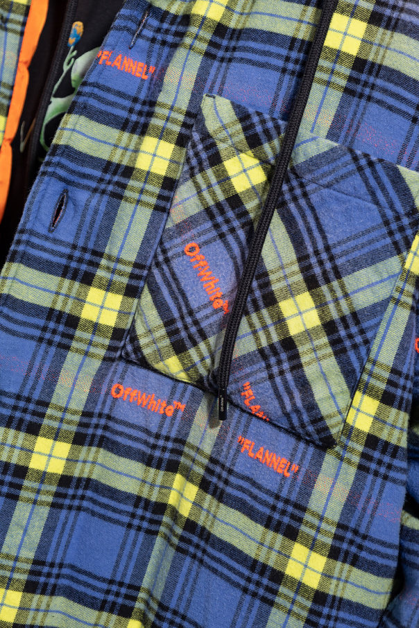 Blue, black and yellow jacket from Off-White. Crafted from checked cotton, this style features button fastenings, a drawcord-adjustable hood, red logo embroidery, a white logo print, four frontal pockets, orange quilted polyester padding and long sleeves with button cuffs.