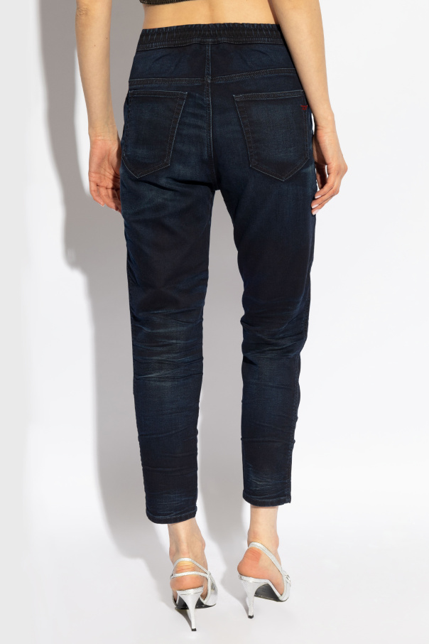 Introducing the ‘2041 D-FAYZA’ Jeans from the exclusive collection of the renowned designer, Diesel. These women\'s jeans redefine casual elegance with their sophisticated navy hue and unique design elements. Crafted from a premium blend of 52% Lyocell, 45% Cotton, and 3% Elastane, these jeans offer both comfort and durability, embodying a seamless fusion of luxury and practicality. The ‘2041 D-FAYZA’ features a straight leg cut with a subtle taper towards the ankle, showcasing a modern silhouette that graciously reveals the ankles. The denim\'s natural gradation of navy shades, achieved through a meticulous distressing process, adds a touch of authenticity and character, making each pair uniquely exquisite. Distinctive details such as the adjustable drawstring waistband, which is a rare find in classic jeans, provide an impeccable fit and underscore the item\'s exclusivity. Further embellishments include a conventional button and zipper closure, belt loops, and a versatile five-pocket design, enhancing both functionality and style. The jeans are also adorned with a red-and-white designer logo patch, a testament to Diesel\'s signature craftsmanship and attention to detail. Why Purchase This Product? Exclusive Design: Stand out with the unique drawstring waistband and sophisticated navy gradient. Premium Material: Luxurious blend of Lyocell, Cotton, and Elastane ensures comfort and longevity. Versatile Styling: Perfectly pairs with diverse wardrobe pieces, from leather jackets to casual tees. Renowned Craftsmanship: Diesel’s commitment to quality and fashion-forward design is evident in every detail.
