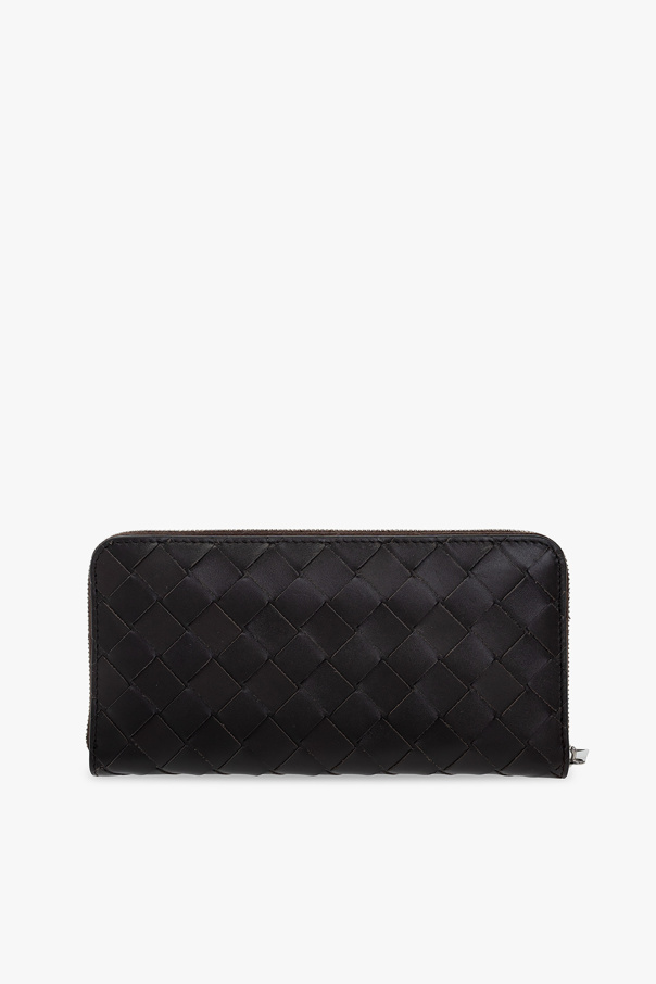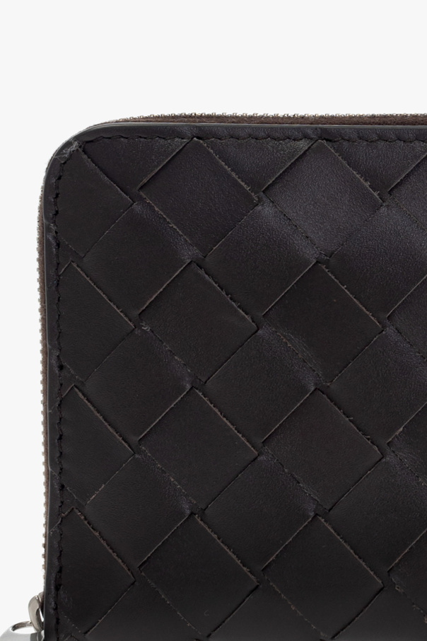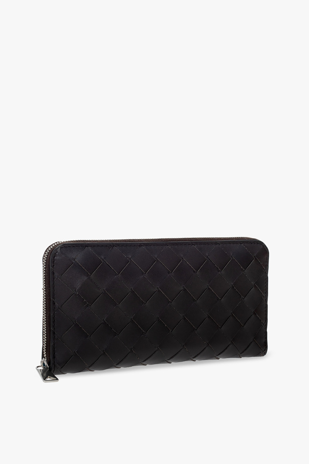 Dark brown wallet from Bottega Veneta. Crafted from calf leather and lamb leather with the brand\'s iconic Intrecciato weave, this design features a zip fastening, silver-tone metal hardware and a blue-clad interior with two bill compartments, two slip pockets, one zipped coin pocket and eight card slots.
