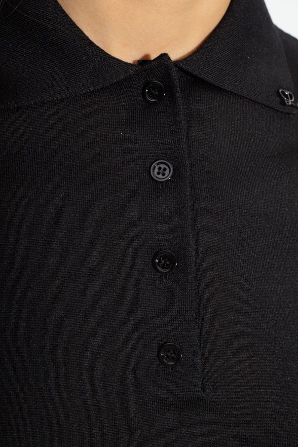 Black polo shirt from Loewe. Made of silk with a tailored fit, this style fastens with buttons and showcases a metal monogram plaque. It is complete with short sleeves and ribbed trims on the edges.