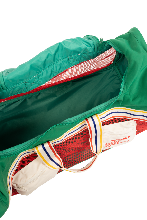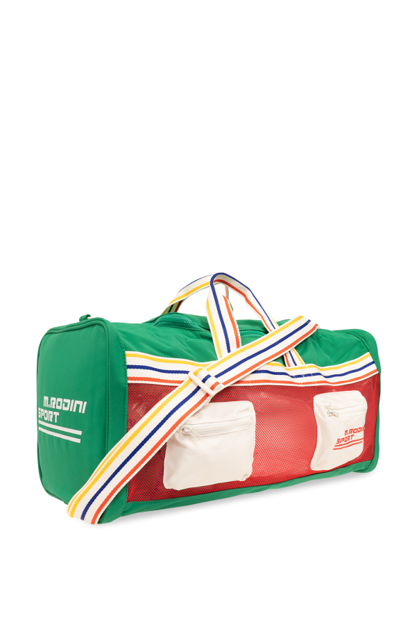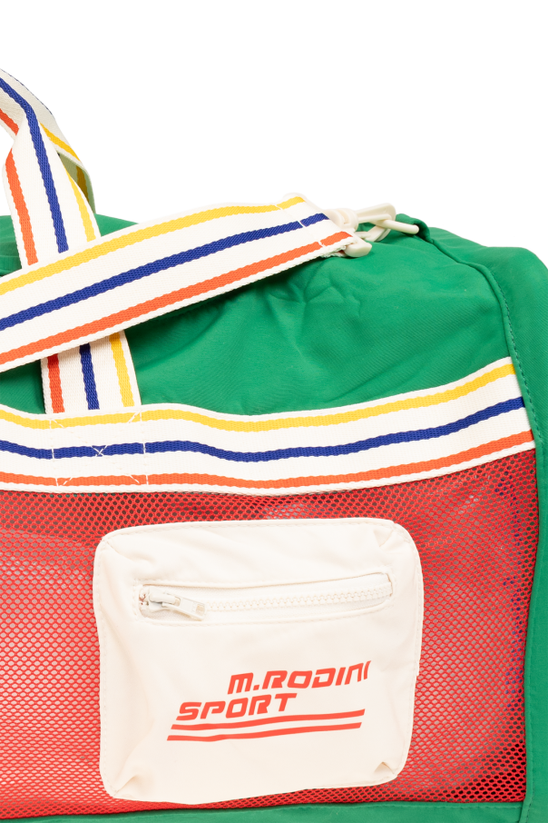 Multicoloured training bag from Mini Rodini. Made from recycled material with water-repellent BIONICFINISH®ECO coating, this design fastens via a zip and showcases a printed logo, mesh trims, two zip pockets on the front, one internal compartment as well as two colourful handles and a detachable and adjustable shoulder strap decorated with stripes.