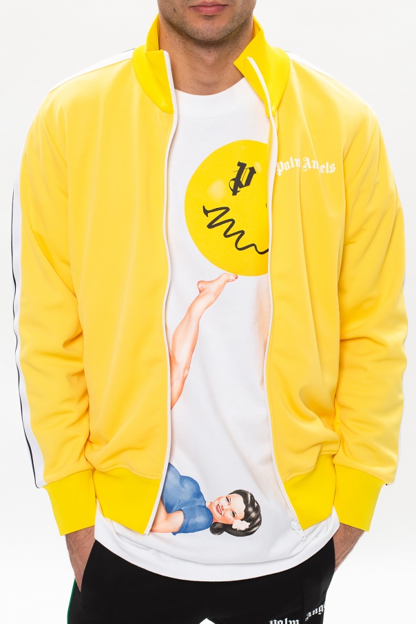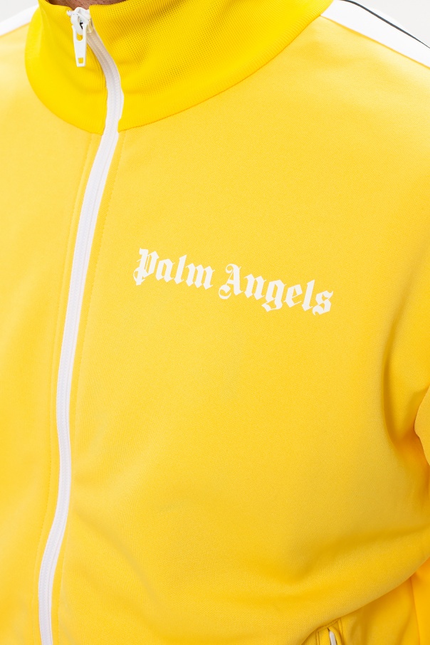 Yellow track jacket from Palm Angels. Printed with the brand's logo and panels in white, this style fastens via zip and employs two zipped pockets and elasticated trims at the bottom hem and cuffs.