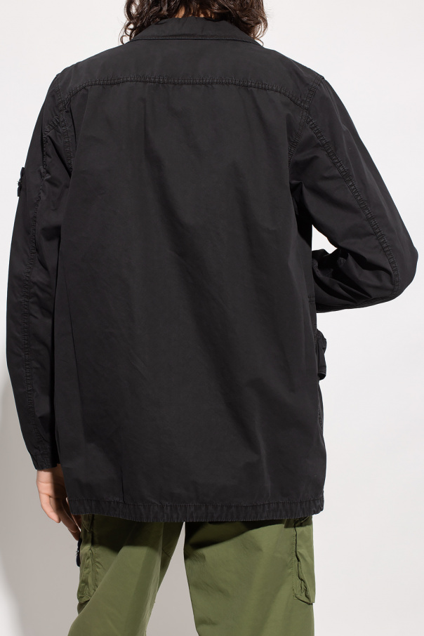 Black jacket with a collar from Stone Island. Made of cotton, this garment features button fastenings, two snap-fastened flap pockets, one zip pocket, multicolored sleeve patch embroidered with a logo and long sleeves with snap fastenings.