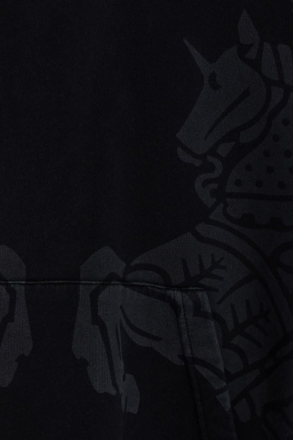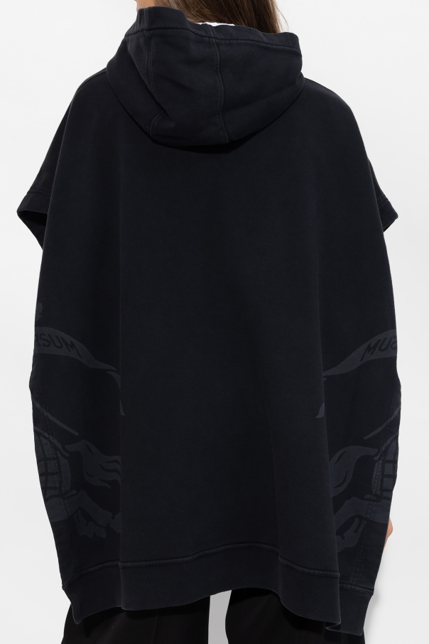 Black hooded poncho from Burberry. Made of cotton, this design features a printed Equestrian Knight motif, front pocket and elasticated panel at the back.