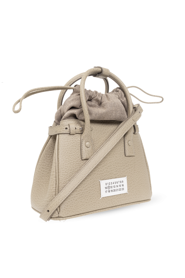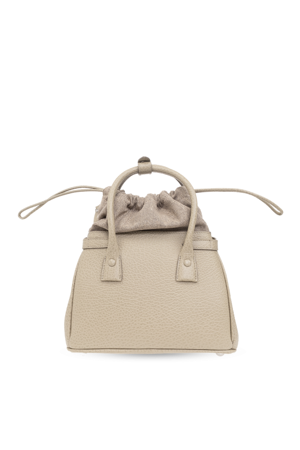 Greyish beige ‘5AC Small’ shoulder bag from Maison Margiela. Crafted from leather and trimmed with fabric, this design cinches closed with drawstrings and features a signature white logo patch on the front. It is complete with a detachable and adjustable strap, two half-round handles, silver-tone metal hardware and one internal compartment with a slip pocket.