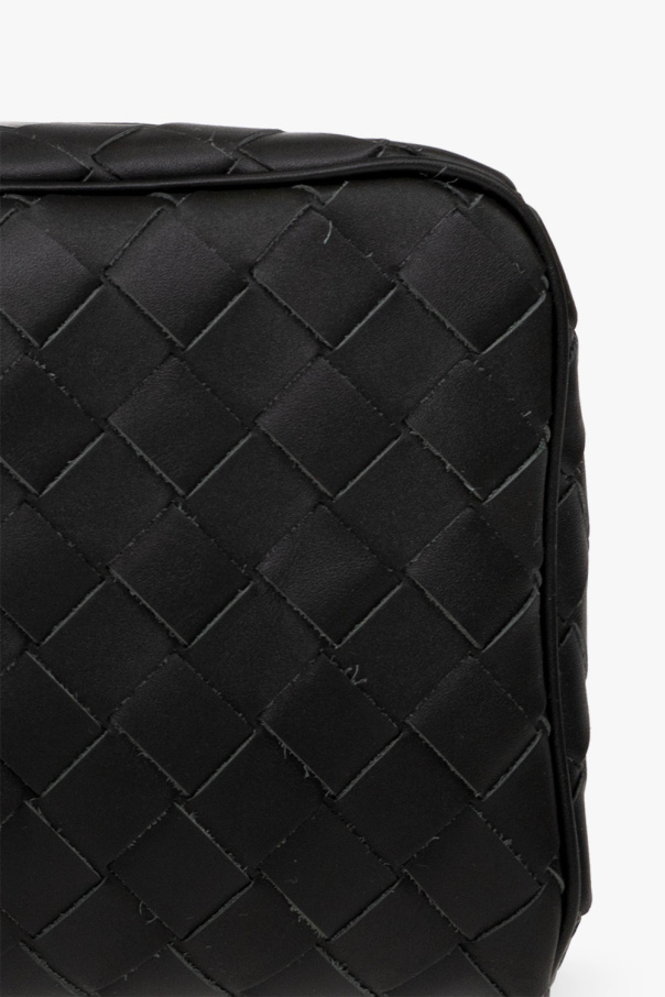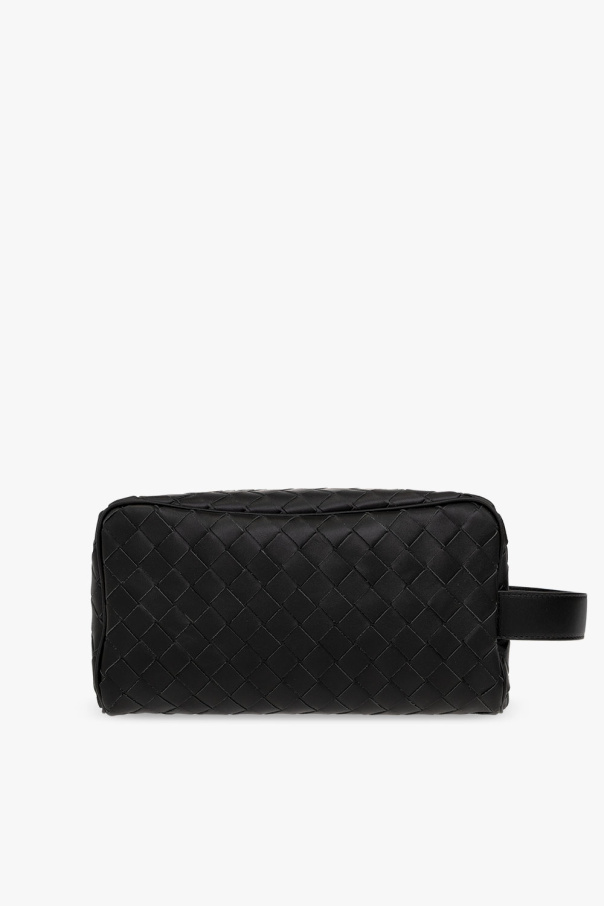 Dark green wash bag from Bottega Veneta. Crafted from calf leather with the brand\'s signature ‘Intrecciato’ weave, this design fastens with a zip and features a half-round handle and one internal compartment.