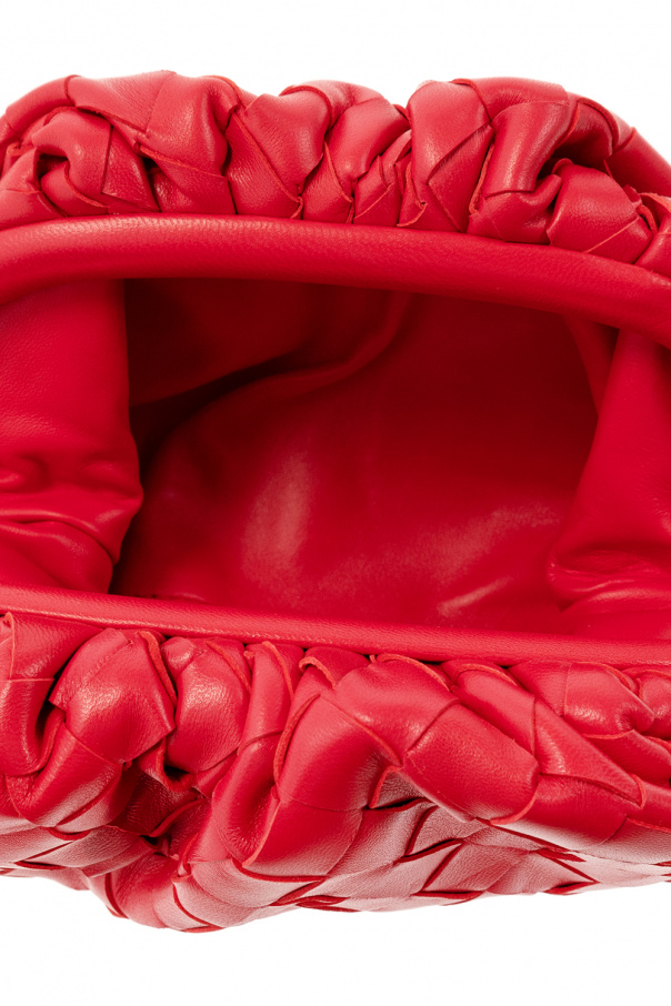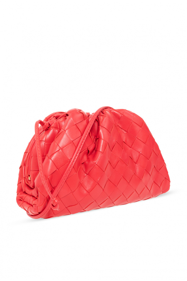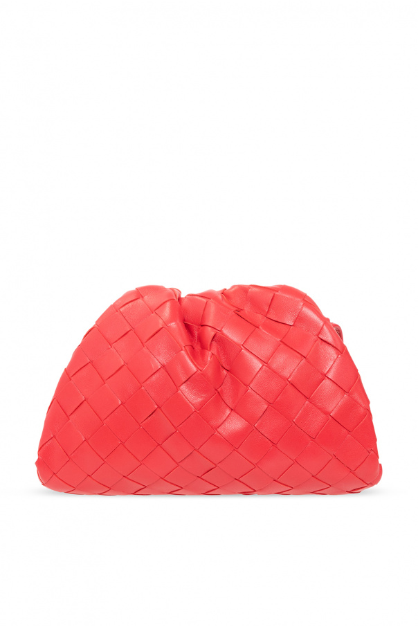 Pinkish red ‘Pouch Mini’ shoulder bag from Bottega Veneta. Crafted from lamb leather, this pair features a magnetic snap closure, gathers, the label’s signature Intrecciato weave, adjustable shoulder strap, one internal compartment and gold-tone metal hardware.
