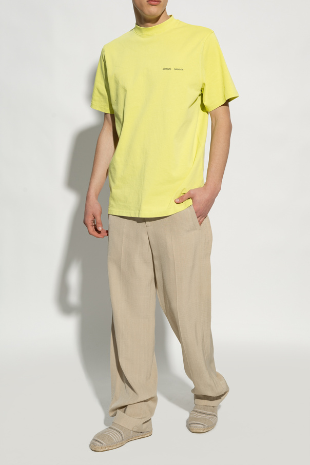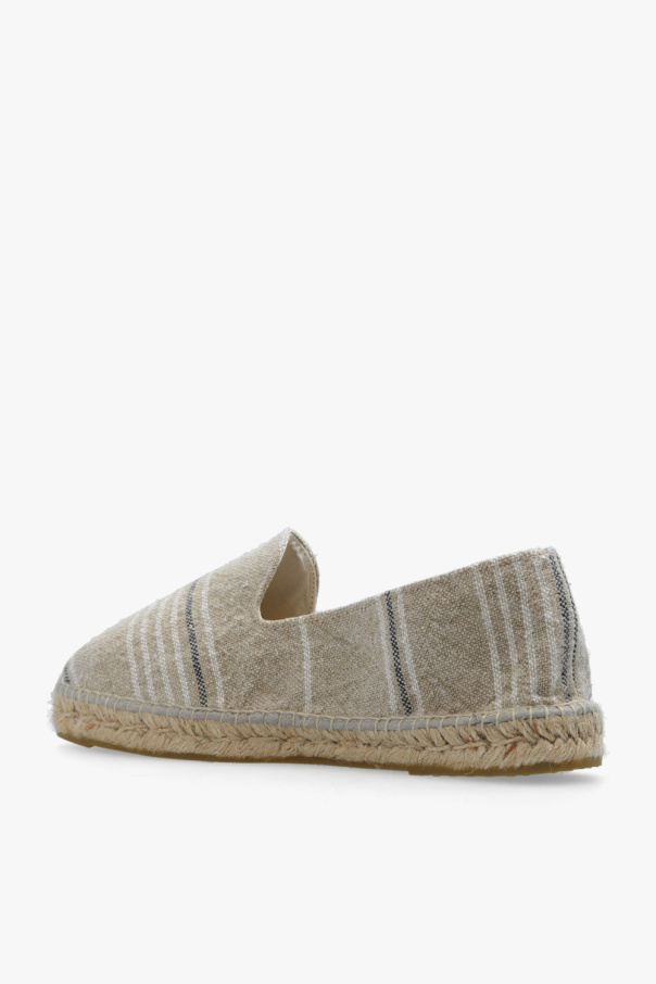 Beige espadrilles from Manebi. Made of linen, this model sits on a natural jute sole trimmed with a thin layer of beige rubber and features a white and navy blue stripe pattern and the brand\'s logo embroidered on the side.