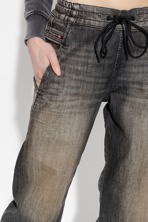 Grey ‘D-KRAILEY-F-T’ jeans from Diesel. Made of cotton, this pair is complete with an elastic drawstring waistband, worn effect, four slip pockets and ribbed cuffs.