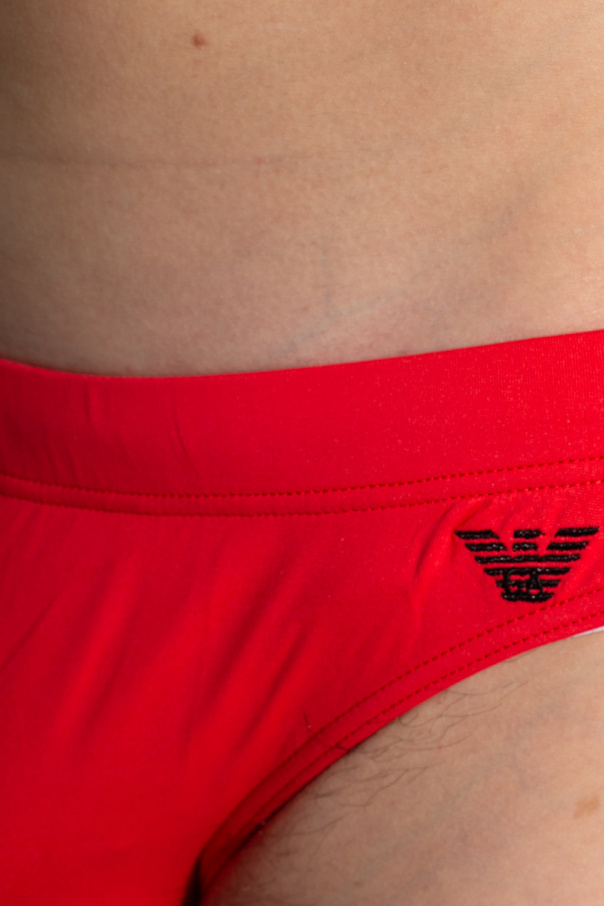 Red swim briefs from Emporio Armani. Fastened with drawstrings, this design features a black logo embroidery.