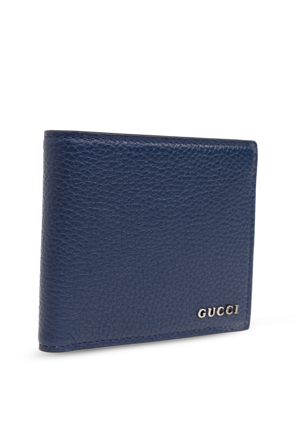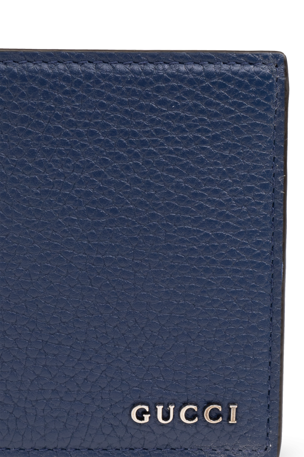 Navy bifold wallet from Gucci. Made from grained calf leather, this model is decorated with a metal logo detail and features two bill compartments, one snap-fastened coin pocket, two slip pockets and four card slots inside.