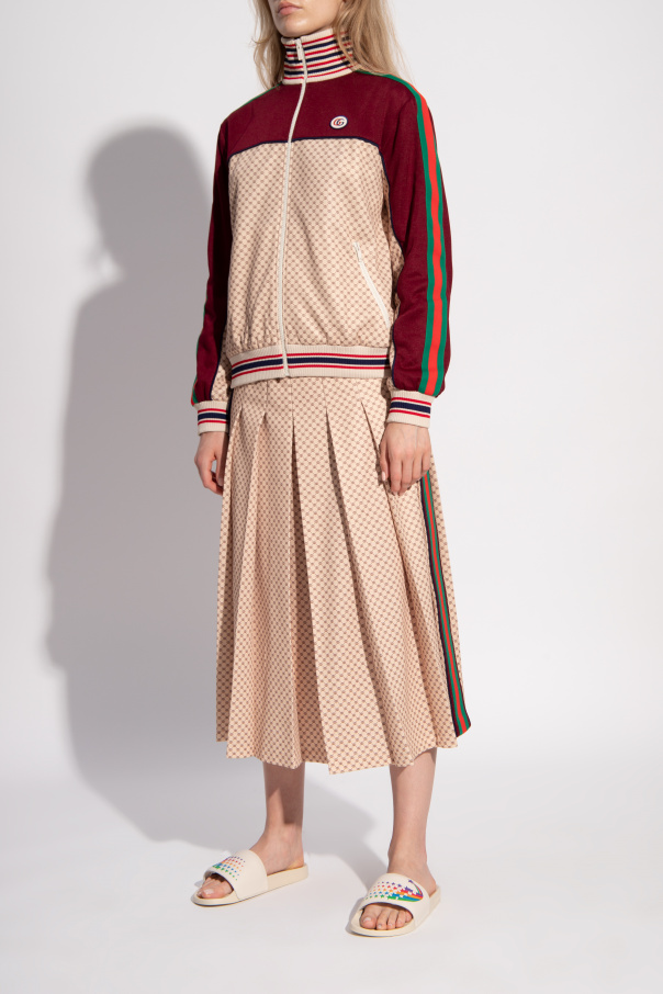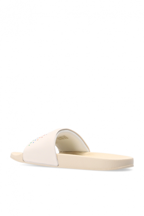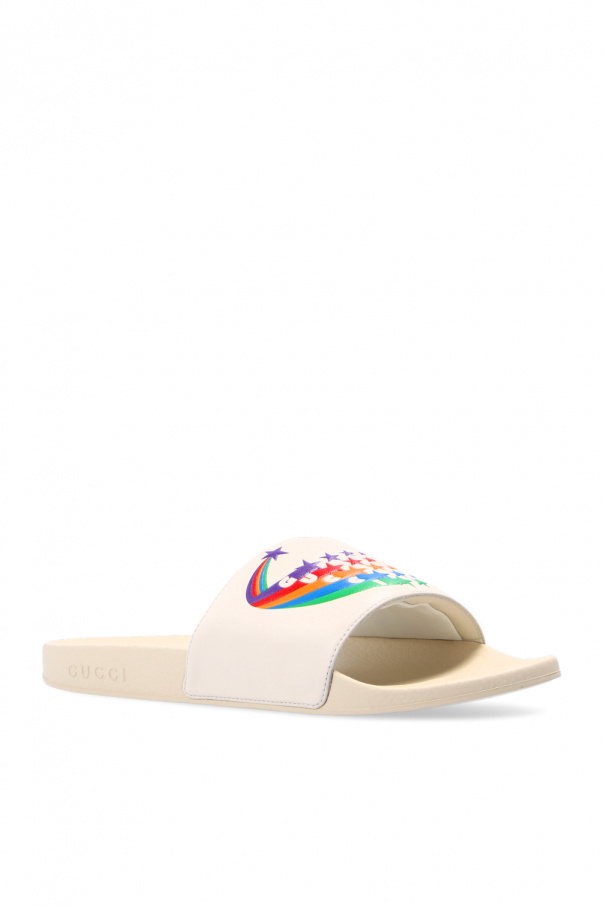 Cream slides from Gucci. Made of leather, this pair sits on a cream rubber sole and showcases a colourful graphic print with the brand's logo.