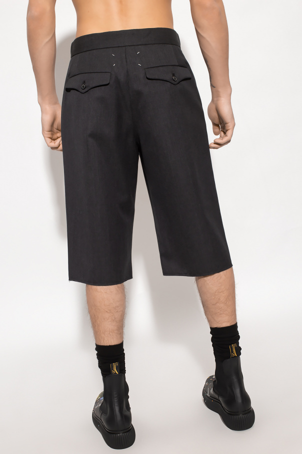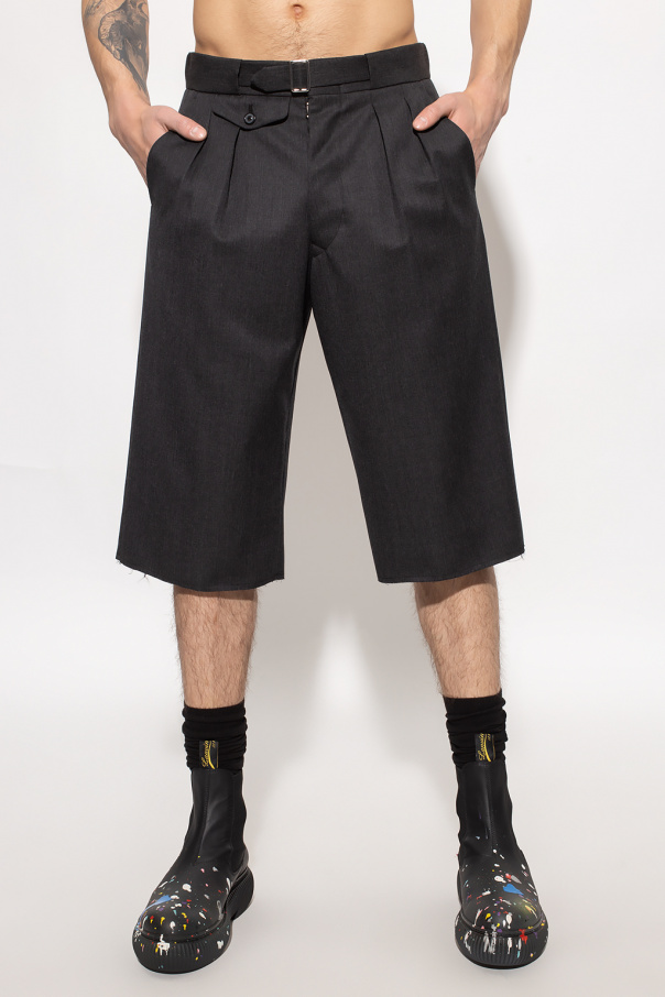 Dark grey shorts from Maison Margiela. Made of wool, this pair features a zip fly with a button, a sewn-in belt with a buckle, three slip pockets on the front, two flapped pockets at the back, pleat detailing and frayed hems.