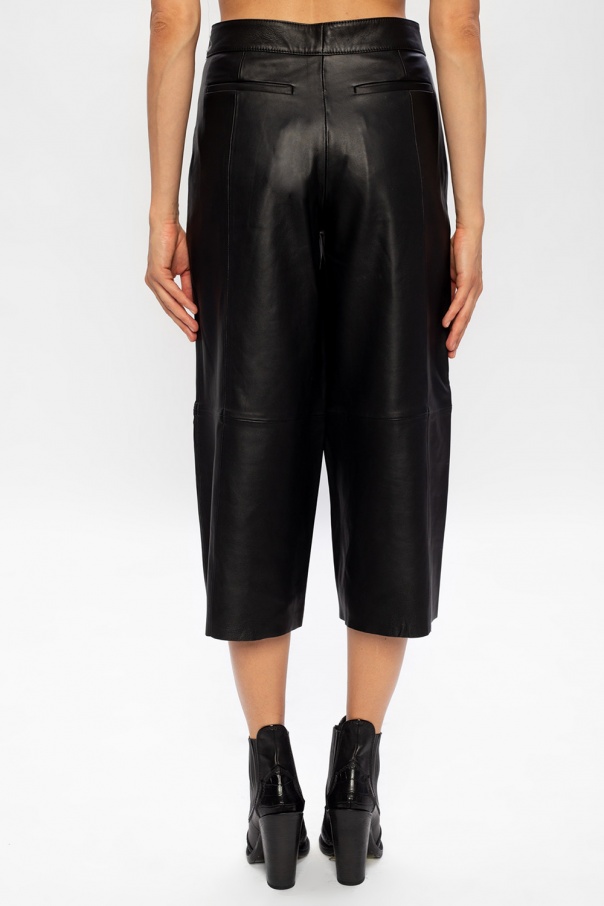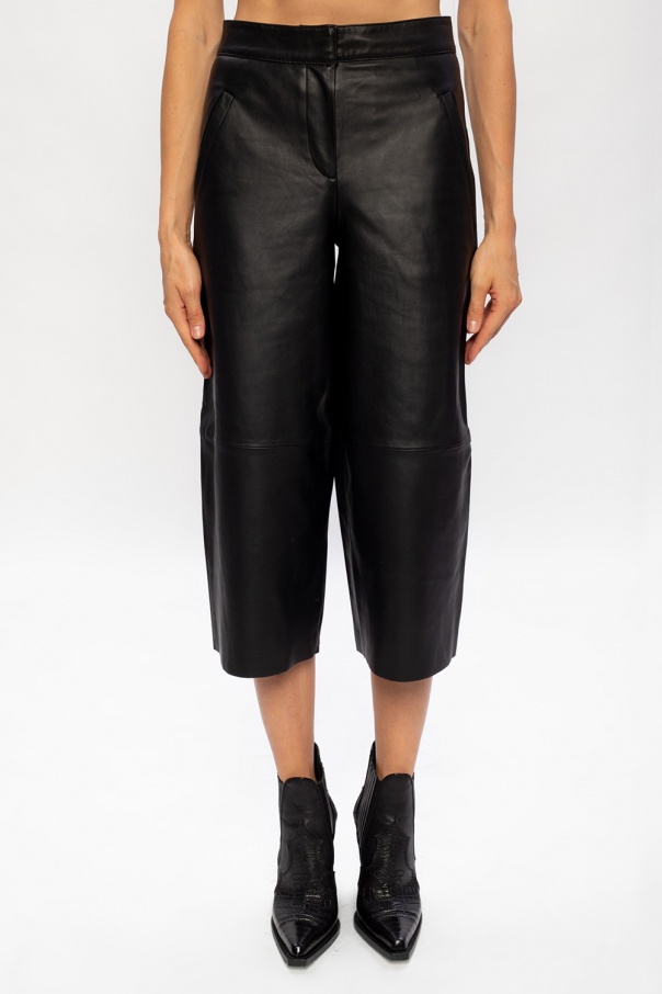 Black \'Leah\' trousers from AllSaints. Crafted from lamb leather, this pair falls down with wide legs and employs zip fly, hook fastenings, two slant front pockets an two welt back pockets.