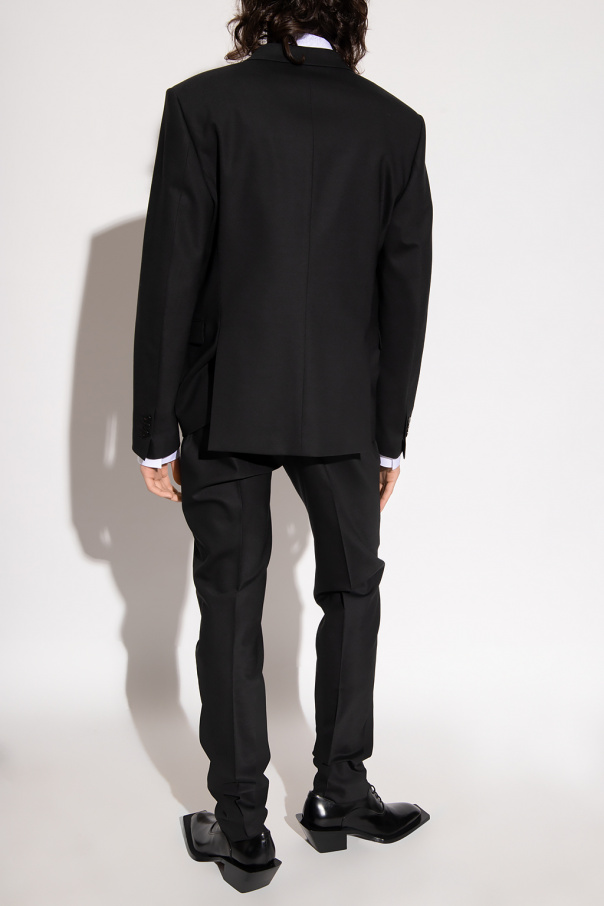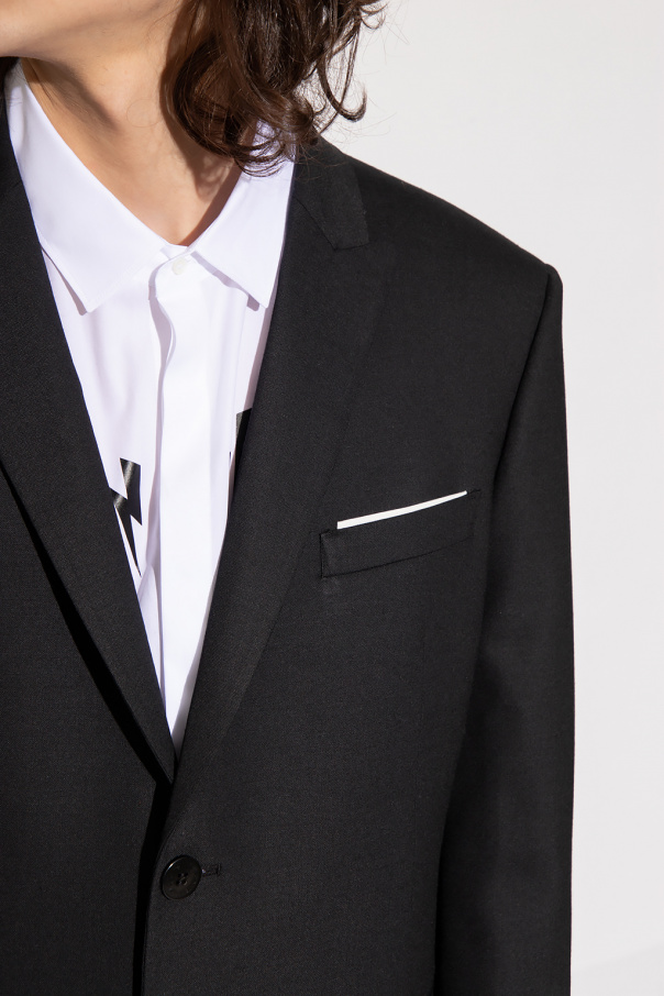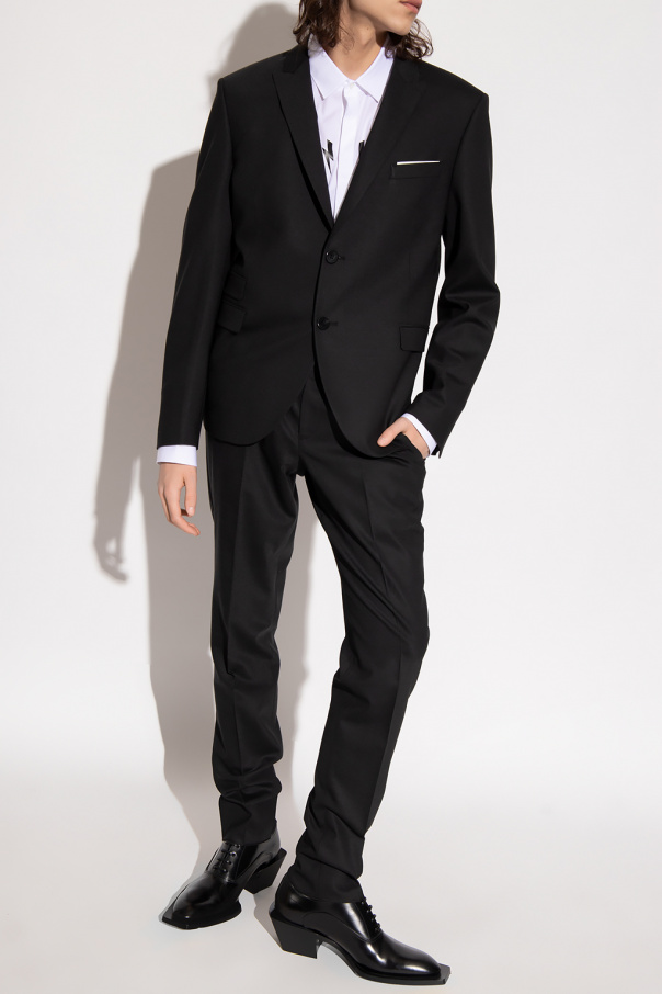 Black suit from Neil Barrett. This ensemble includes a blazer featuring button fastenings, peak lapels, three flapped pockets, one slip pocket accentuated with a white pocket square, long sleeves and a double back vent as well as trousers with a zip fly with buttons, two side seam pockets, two back button pockets and slightly tapered legs with darts.