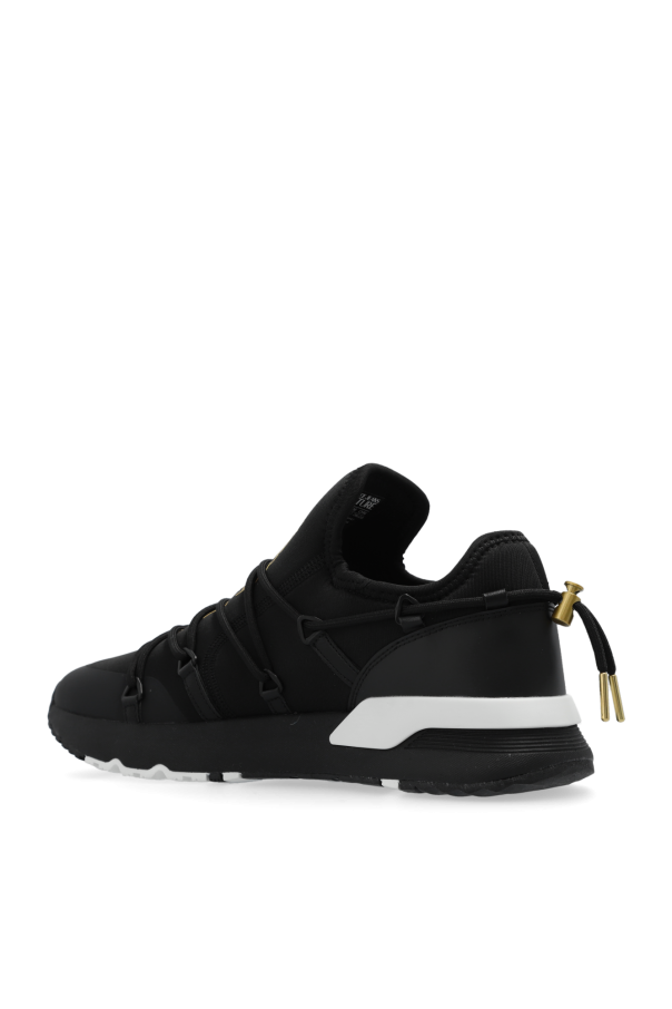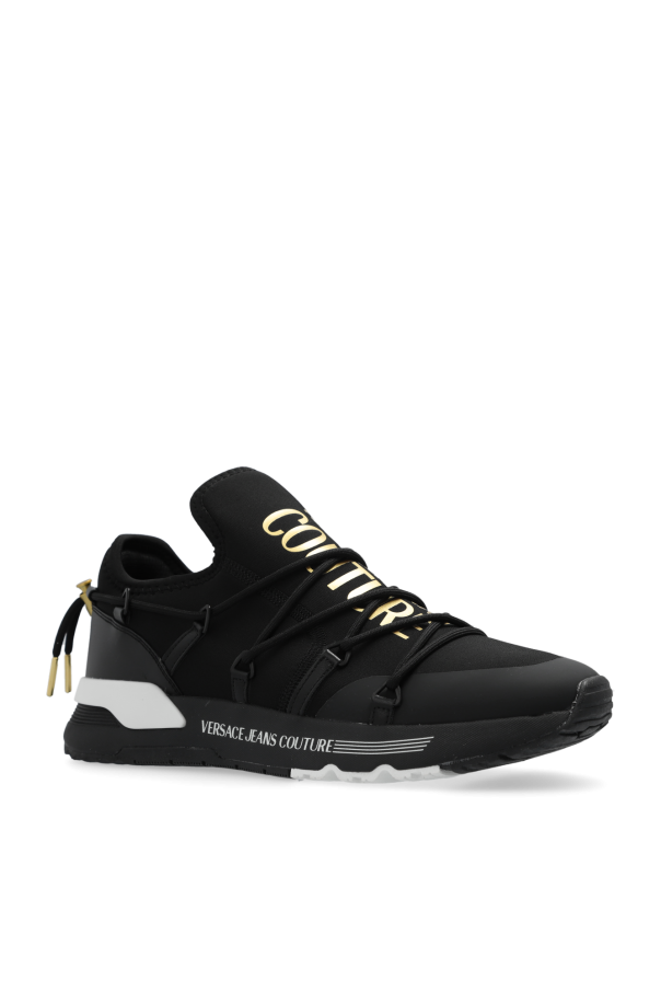 Black, white and gold-tone sneakers from Versace Jeans Couture. Embellished with a logo pattern, this model sits on a white and black rubber sole and features a slip-on silhouette and a self-locking lacing system.