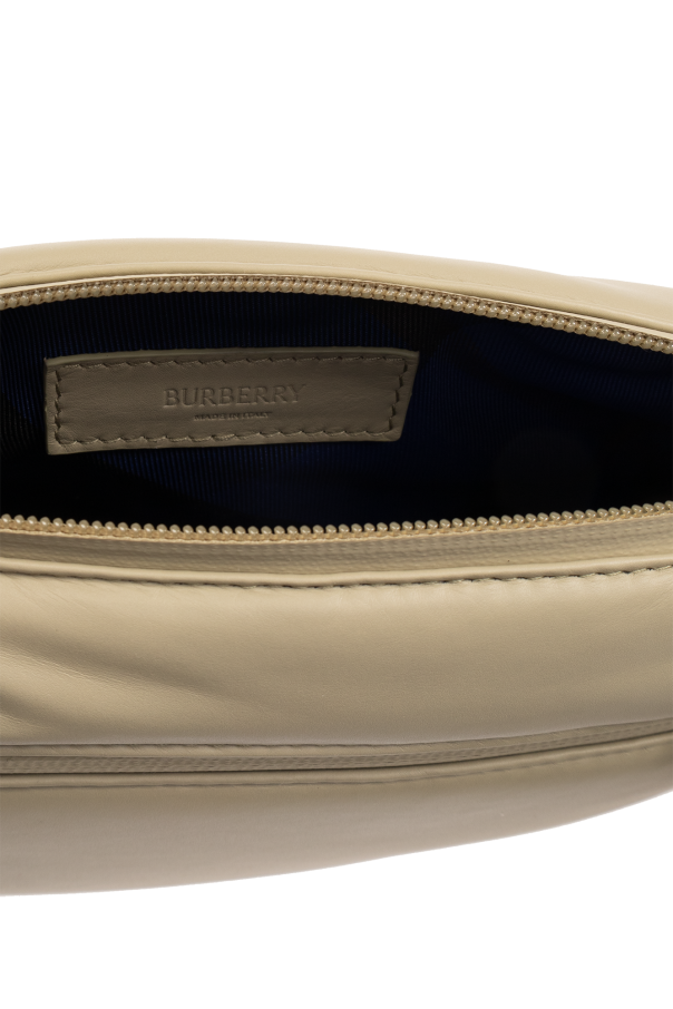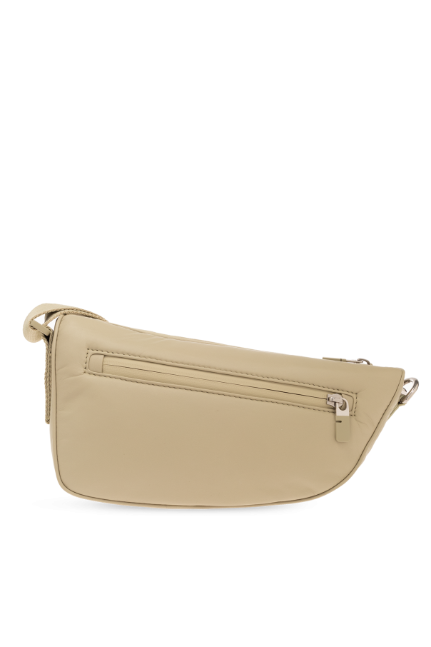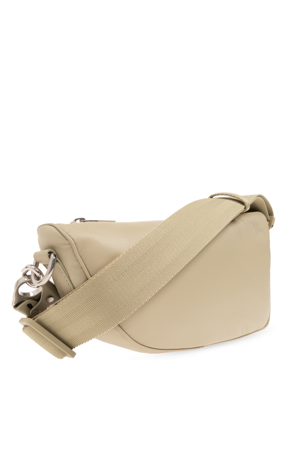 Greenish-grey ‘Shield Mini’ shoulder bag from Burberry. Made from patent lamb leather with an aged texture, this design fastens via a zip and showcases an embossed logo on the front, one zip pocket on the back, silver-tone metal hardware as well as an adjustable shoulder strap and one internal compartment.