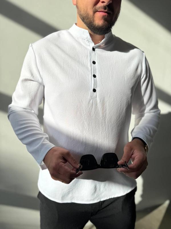 Мужская льняная рубашка белая воротник стойка с длинным рукавом