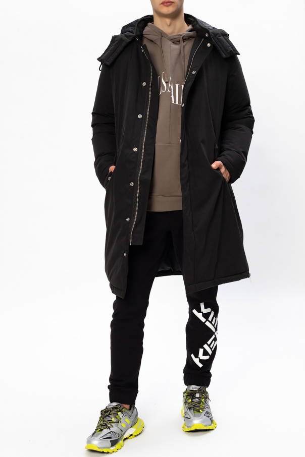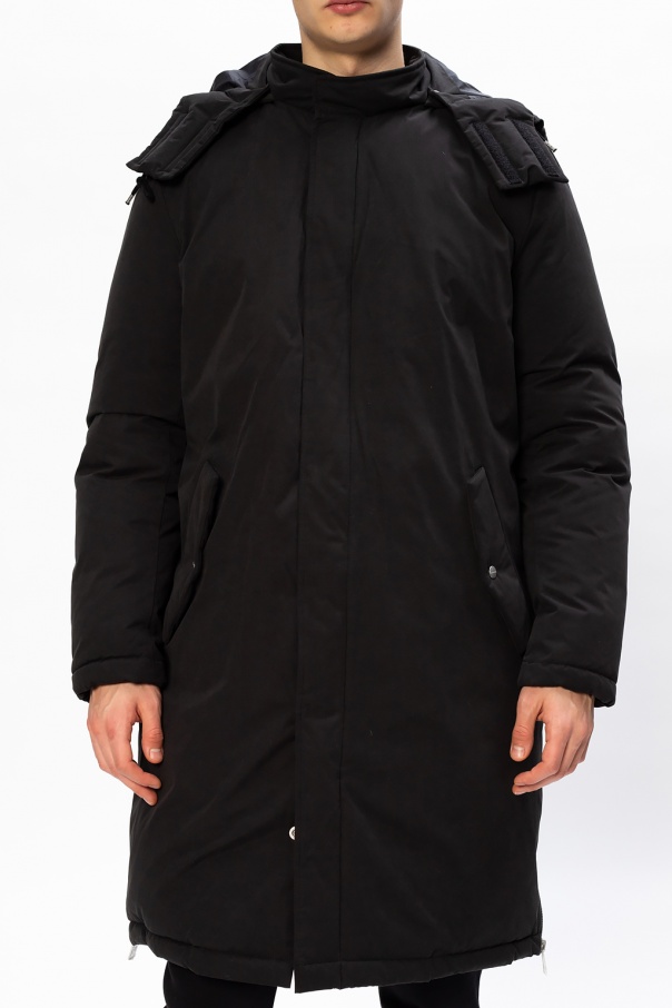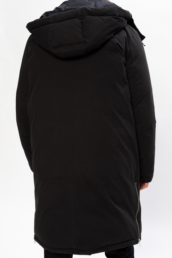 Black \'Elm\' coat from AllSaints. Finished with down and feather padding, this design fastens via a two-way zip and snap-buttons and employs a detachable hood with cinching drawstrings, two snap-fastened flapped pockets on the front and zipped vents to the sides.