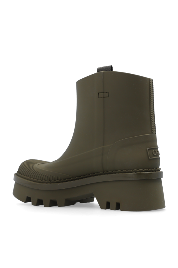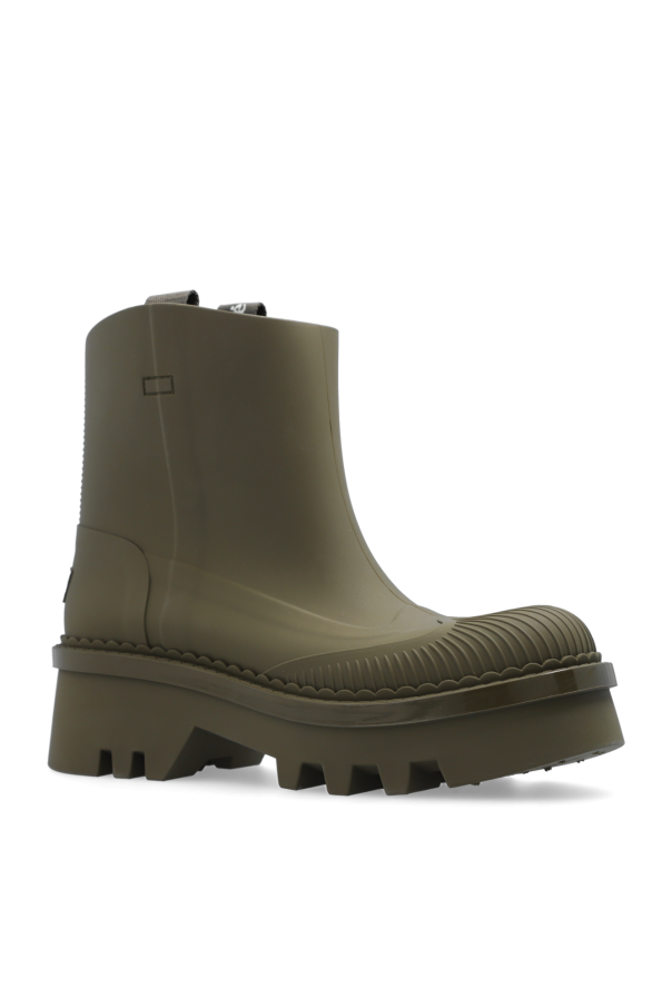 Dark green ‘Raina’ short rain boots from Chloe. Made of rubber, this model sits on a dark green rubber sole and features a tactile logo at the back and short handles on the sides.