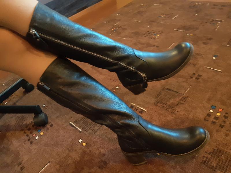 Чобітки жіночі, із натуральної шкіри. Розмір 39, об'єм-38,зручний каблук висотою 6 см.Одягалися декілька раз,не підійшов розмір.Всередині утеплені овчиною,теплі та зручні.