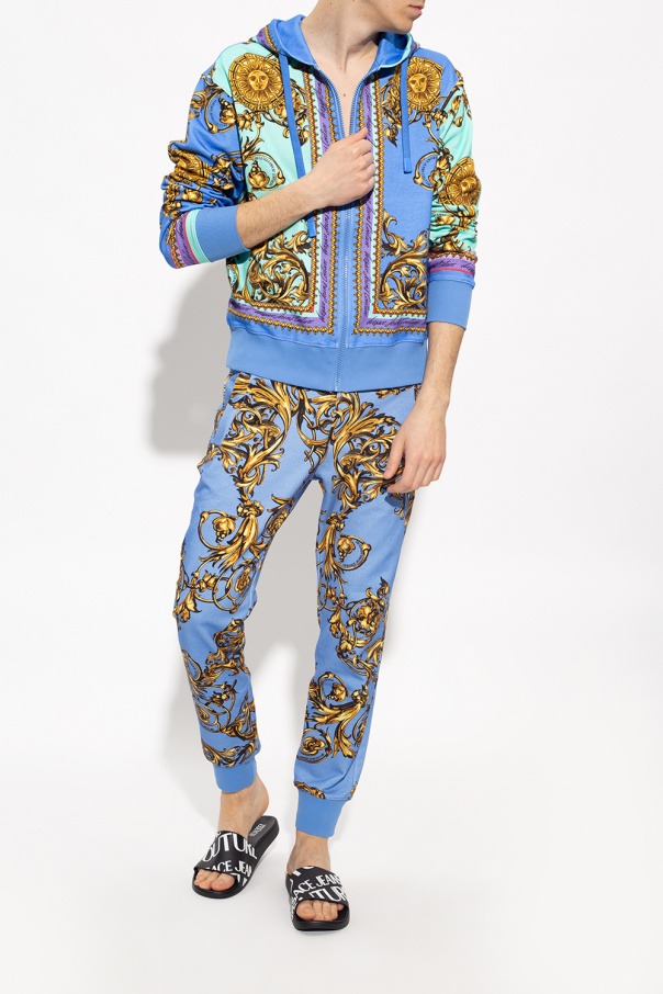 Black slides from Versace Jeans Couture. Sitting on a black rubber sole, this model showcases an embossed white logo pattern.