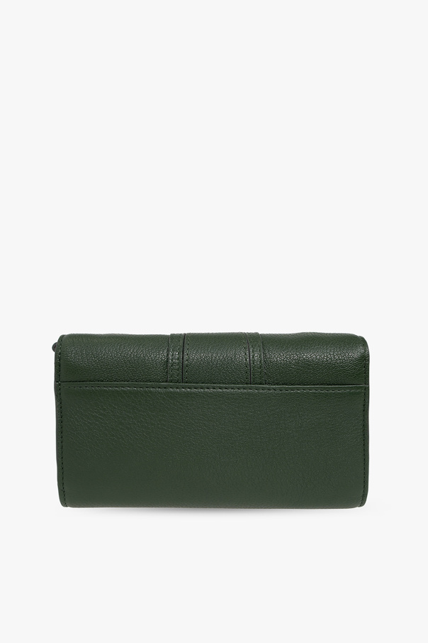 Dark green ‘Hana’ wallet from See By Chloé. Crafted from goat leather, this item features a flap with a magnetic snap, decorative ring braided with leather, logo charms, shoulder chain and gold-tone metal hardware. It has a phone pocket, zip pocket, one s