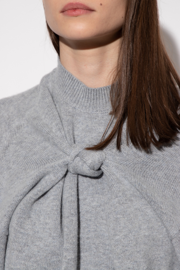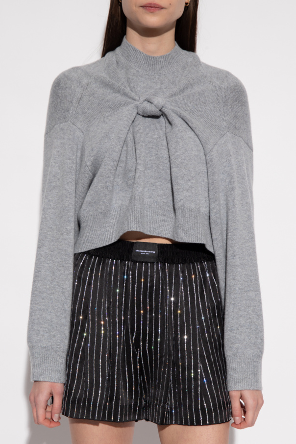 Grey sweater from Alexander Wang. Crafted with a cropped silhouette, this style features a mock neck, a distinctive draped knotted detail, and elasticized trims on the collar, bottom hem and cuffs.