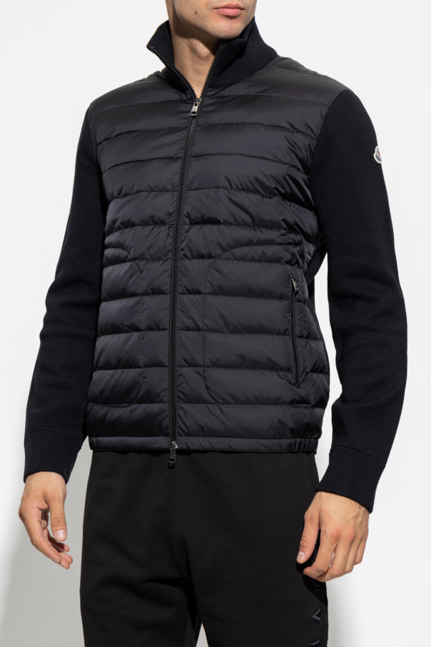 Black sweatshirt with a quilted down front from Moncler. Fastened with a two-way zip, this garment features two zip pockets, felt patch at the shoulder, ribbed hem and knitwear panels at the back, sleeves and stand collar.