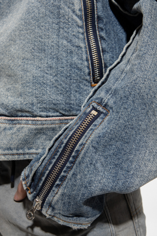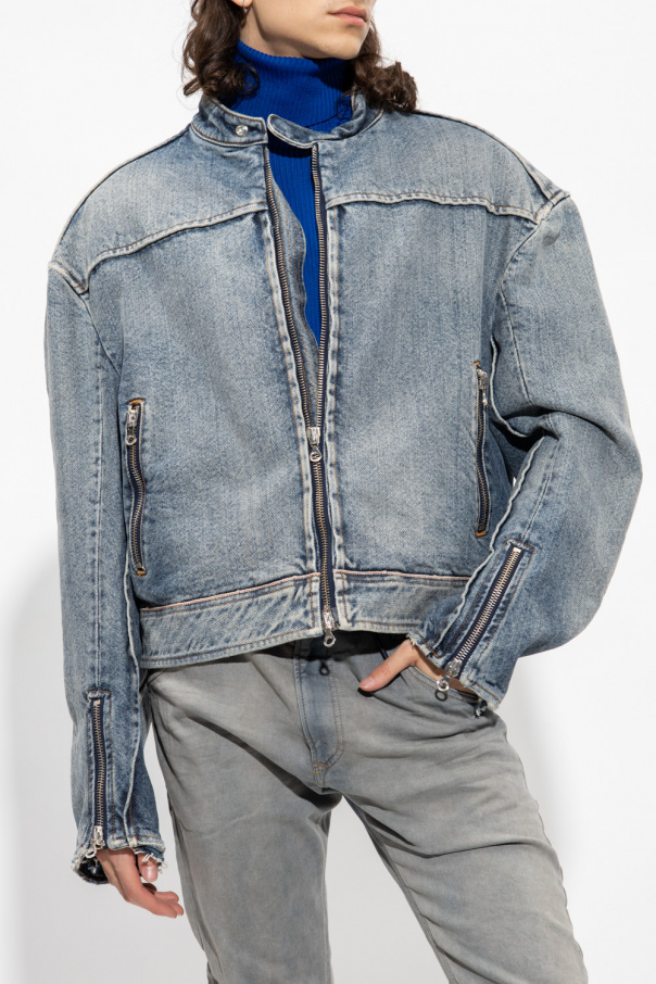 Blue and cream ‘D-RECTOR-FSB’ jacket from Diesel. Made of cotton, this design features a two-way zip, worn effect, two zip pockets, long sleeves and raw cut edges.