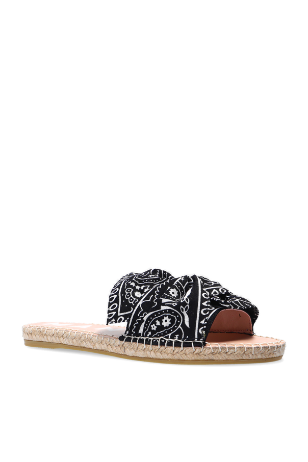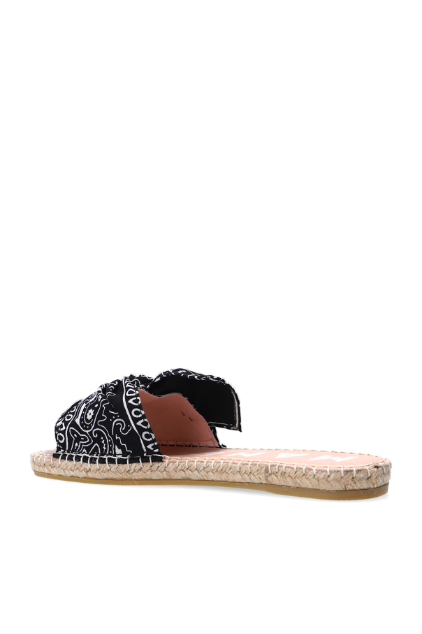 Black and white \'Bandana\' slides from Manebi. Illustrated with a pattern, this cotton-crafted pair sits on a beige rubber sole and features a bow and a platform trimmed in natural jute in beige. This product is 100% vegan.