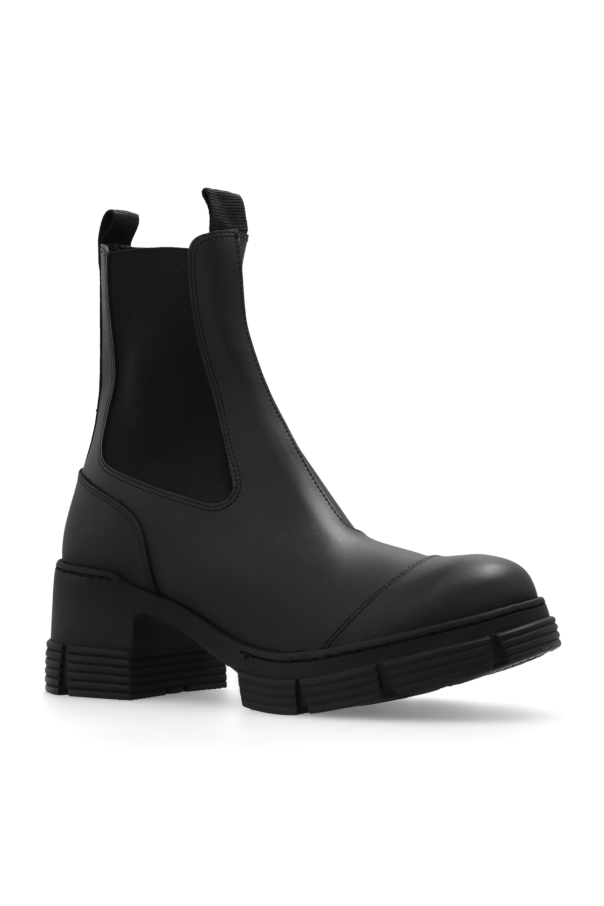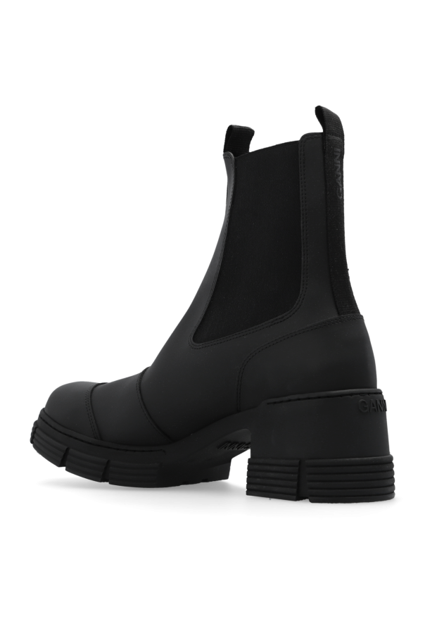 Black ‘City’ heeled boots from Ganni. Crafted from a blend of recycled rubber with an almond-shaped toe, this model sits on a chunky black rubber sole and features an embossed logo and elastic panels on the sides.