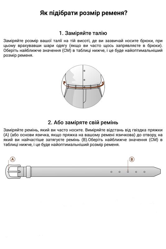 Ширина ремня составляет 3.8 см, а длина – до 130 см. Возможно изготовление на заказ ремня длиной до 160 см.• Подарункова упаковка: